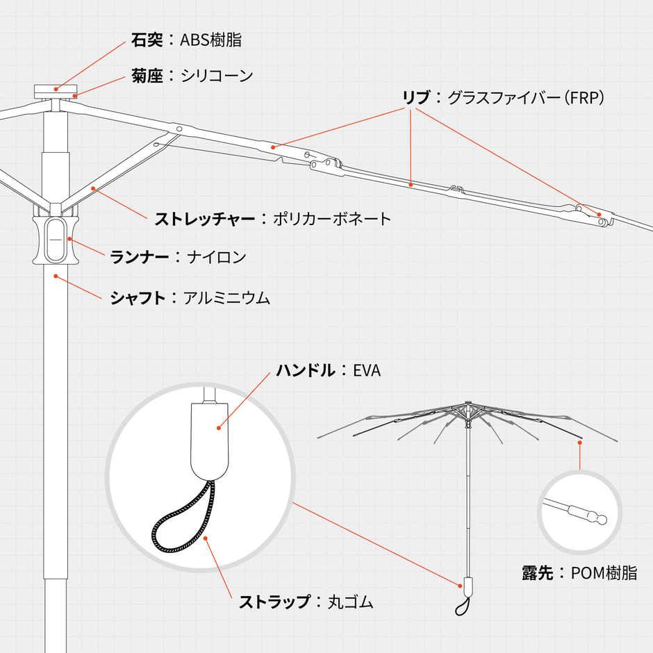 傘の上部が太くなっているため、ランナーとシャフトがぴったりとフィットし、強風でもグラつきにくい構造になっているのです。